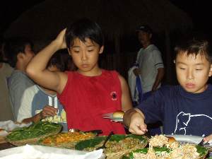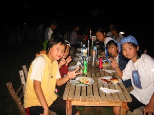 | ビュッフェスタイルの夕食 | 屋外テーブルでろうそくの火の元で |