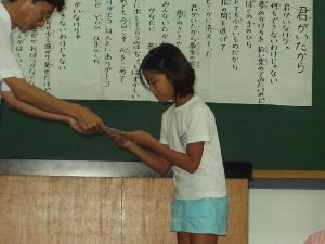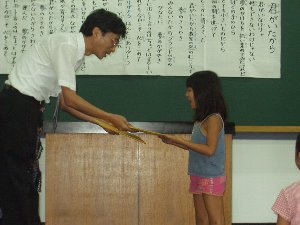 校長先生から記念品をもらいます