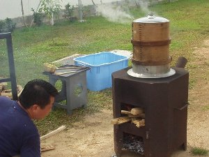 特製かまどでもち米を蒸します