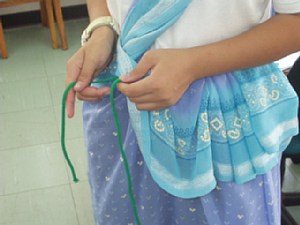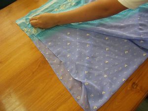 ↑(10)(8)で左手で余ったサリーをひもの中に通します。
