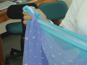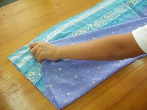 ←(1)端っこのあまり柄のないほう(1mぐらい)を机などにおいて2つ折りにします。