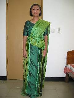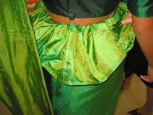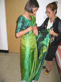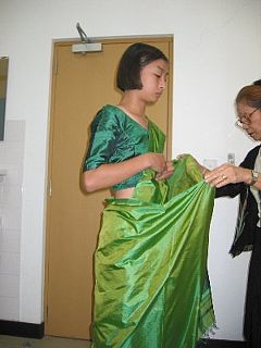 1.初めにペチコートとブラウスを着ます。 次にサリーの丈を自分に合わせます。この時、安全ピンなどのピンでしっかり固定すると良いでしょう。