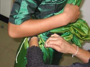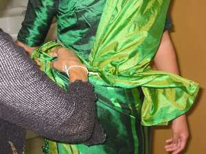 2.肩に布をかけて、あまった布を腰に巻いていく。