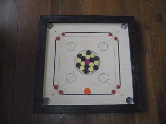 人数は、2人から4人で行います。4人で行う場合は、2チームに分かれ味方同士が対面になるようにします。やり方は、オレンジ色の打ち玉を領域内から自分の持ち玉に当て、4角の穴に入れていきます。自分が打ち出す領域は、自分サイドの赤丸から赤丸の間です。おはじきをはじく要領ではじきますが、スリランカの人は中指を使います。持ち玉は先攻チームは白の玉、後攻チームは黒の玉になります。持ち玉が穴に入ったら続けてプレーできます。残りが3つ以下になったら真ん中にある赤玉を穴に入れ、続けて持ち玉を入れます。もし、続けて入らなかったら、入った赤玉を板の真ん中に戻します。先に全部の玉を入れたチームが勝ちです。白熱するのは、赤玉とお互いの持ち玉が一つずつ残った時です。