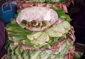 キンマの葉は日本や中国、韓国などの東アジアをのぞくアジア諸国で広く愛用されています。木の葉に木の実や石灰をくるんでかみます。そうすると口の中が真っ赤になります。写真のようにして、道ばたで売られています。葉の中に入っているのが木の実、皿の右はじに見えるのが石灰です。スリランカでは、しこう品として売られているだけでなく、お客様を呼んだときにその葉をわたしたりします。日常生活の様々な場面でコミニュケーションをとるための大切な小道具として使われているそうです。