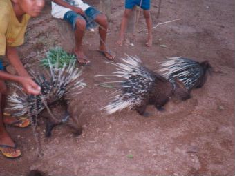 体長は、約90pくらい。島中の広い範囲に住み、低地の所が好きらしい。特徴は、体の前方がかたく長い毛でおおわれていて、背中から尾にかけてとげがあります。昔は、そのとげがペンとして使われたそうです。