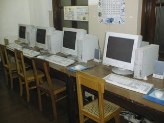 パソコン室(図書室兼用)です。現在6台のパソコンが置いてあり,インターネットを使った授業やホームページづくりに使われています。 |