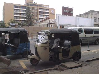 通称バジャージ。(バジャージという会社が作っているから。)小さくって、後ろに3人のれます。(せまい!)オートバイに自動車風のボディを無理矢理くっつけた感じで、色は、クリーム色や青・黄色などさまざまです。中には花や赤ちゃんの写真・おしゃかさまなど派手にデコレーションされているものもあります。ドアは、いっさいありません。タイヤは3つついています。乗るときは、値段などの交渉が必要です。