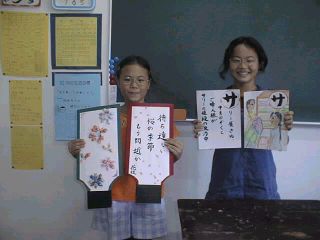 「筆で遊ぼう」では、筆で文字を書いてカルタ作りをしたり、はご板を作りをしたりしています。1学期は、スリランカに関係するカルタづくりをしました。2学期は、画用紙ではごいた作りました。表には自分の作った俳句、裏には折り紙で作った花をはりました。今、コロンボ日本人学校に関するカルタ作りをしています。この活動に参加している花枝さん、結美さんは、「コロンボ日本人学校を紹介するカルタを作ろうと思う。おもしろいカルタを作りたい。」と,抱負を語ってくれました。