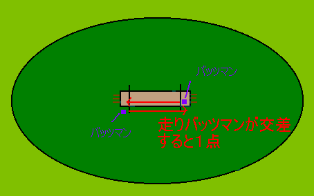 バッツマンの打った球がフィールダーをとおり抜けた際に,ストライカーとノン・ストライカーの2人のバッツマンがそれぞれ元にいた位置と反対のウィケットにランニングで到達すると1点。