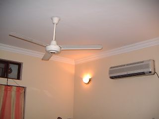 | 天井からつり下がっている扇風機とエアコン |