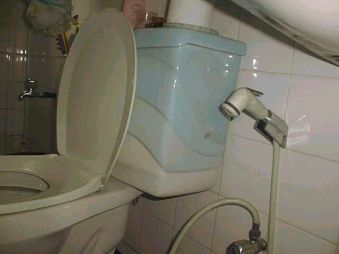 みなさん、右の写真のものはなんだかわかりますか。便器に似ていますが便器ではありません。日本でも同じようなものはありますが、スリランカのものは少し違っています。これは、トイレ(うんち)のあとにおしりを洗う器具です。日本のおしり洗浄器は便器といっしょになっていて、ボタンを押すと下から水やお湯が出てきます。しかし、スリランカのおしり洗浄器は便器のとなりに取り付けてあって、ボタンではなく、蛇口をひねると水が出てきます。下の写真のように、便器のわきにシャワーのようなものが取り付けてある場合もあります。日本でもおしり洗浄器を使っている人はいますが、どの家にもあるわけではありません。しかし、スリランカの洋風の家では、かならずこのような器具が取り付けてあります。それでは、スリランカの家には、なぜこのような器具が取り付けてあるのでしょうか。